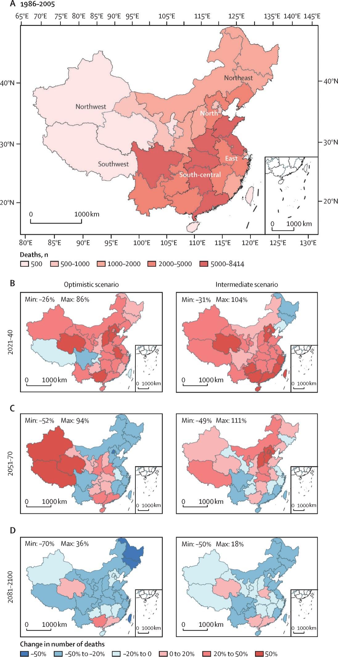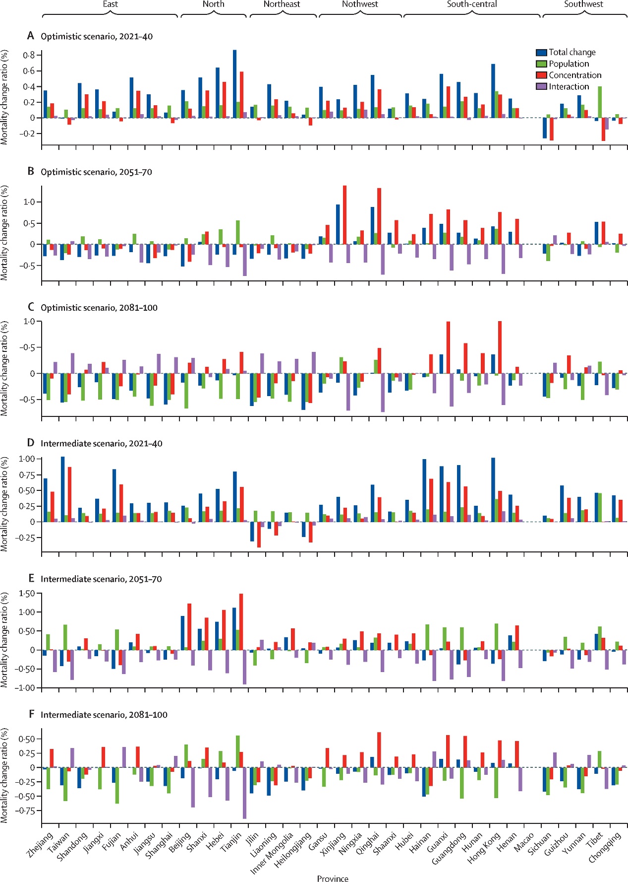 在气候变化背景下,野火(包括森林火灾、草地火灾、灌木丛火灾和农业废弃物焚烧等)未来发生的概率和强度受到广泛关注。野火排放产生的烟雾,尤其是其中的PM2.5对人群有重要的健康影响,需要非常精确的评估。然而,中国区域的野火具有范围小和持续时间短的特征,现有的未来火灾相关死亡风险的预测研究没有细致到省级层面,且采用的参数设置并不适用于中国人群健康体征。预测方法仅采用环境PM2.5暴露估算死亡率,而没有采用针对野火排放的PM2.5暴露估算的流行病学方法。