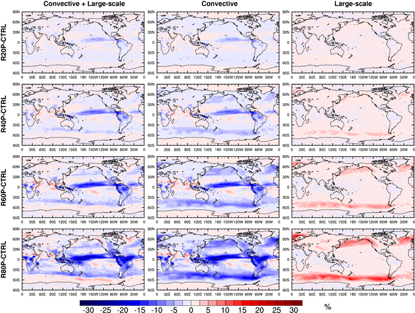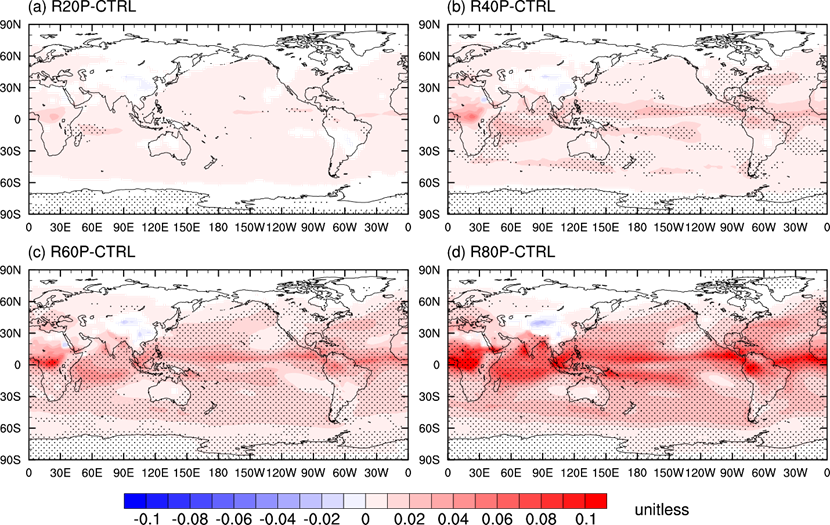 针对上述问题,研究组在美国国家大气研究中心通用地球系统模式(NCAR CESM)的Zhang-McFarlane对流方案中应用一个逻辑算子,通过控制对流触发频率,改进了对流方案对模式水平分辨率的自适应性。为了排除不同分辨率对气溶胶模拟的影响,研究组将该方案应用到同一模式分辨率上,设计了对流相对于参照试验(CTRL)分别减少20%、40%、60%、80%的4组敏感试验(R20P、R40P、R60P、R80P),模拟不同分辨率下对流逐渐减少的情况。结果表明,随着深对流减少,相比CTRL试验,敏感试验中模拟的气溶胶光学厚度几乎在全球范围内逐渐增加,在热带和亚热带地区(图1)尤为显著。