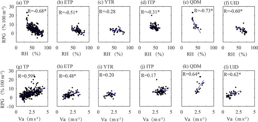 此外,研究进一步分析了降水海拔梯度与气象条件的关系,发现降水的海拔梯度与相对湿度呈现负相关关系,而与风速呈现出正相关关系(图2),即在干燥和大风条件下,海拔越高,降水越大。该发现可为经验性地调整降水海拔梯度提供依据。