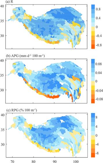图1 第三极地区各子流域(a)年降水量与海拔的相关系数、(b)年降水量绝对海拔梯度(APG)和(c)年降水量相对海拔梯度(RPG, 绝对海拔梯度与流域平均降水的比值)的空间分布。