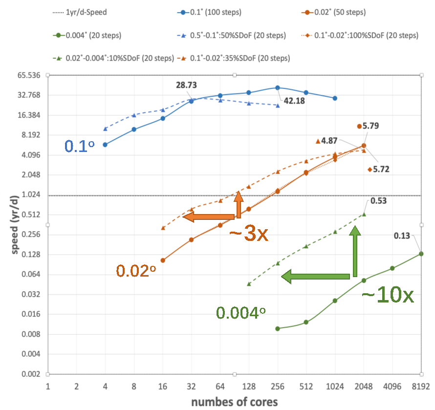 OMARE模式主要面向0.5度(50公里)、0.1度(10公里)、0.02度(2公里)以及0.004度(400米)四种分辨率(空间加密比例均为1:5),分别面向气候模拟、海洋中尺度解析、部分解析次中尺度以及解析大部分次中尺度过程。