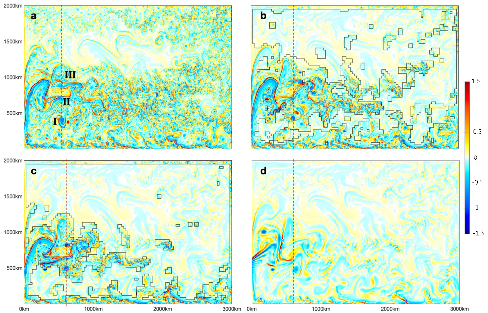 图1. 冬季0.02度全场加密(a)和自适应加密(b与c)试验海表罗斯贝数以及同期0.1度试验结果(d)。