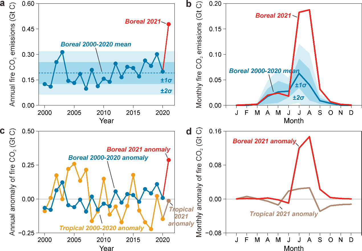 研究发现,北方野火二氧化碳排放自2000年以来呈上升态势,在2021年创纪录地达到了17.6亿吨,占当年全球野火碳排放总量的23%,而在二十年前这一比例通常仅为10%左右。与此相反,受到广泛关注的赤道地区野火燃烧及碳排放呈下降趋势,年际振幅小于北方野火2021年排放异常高值,2021年排放量与多年平均水平相当(图1)。