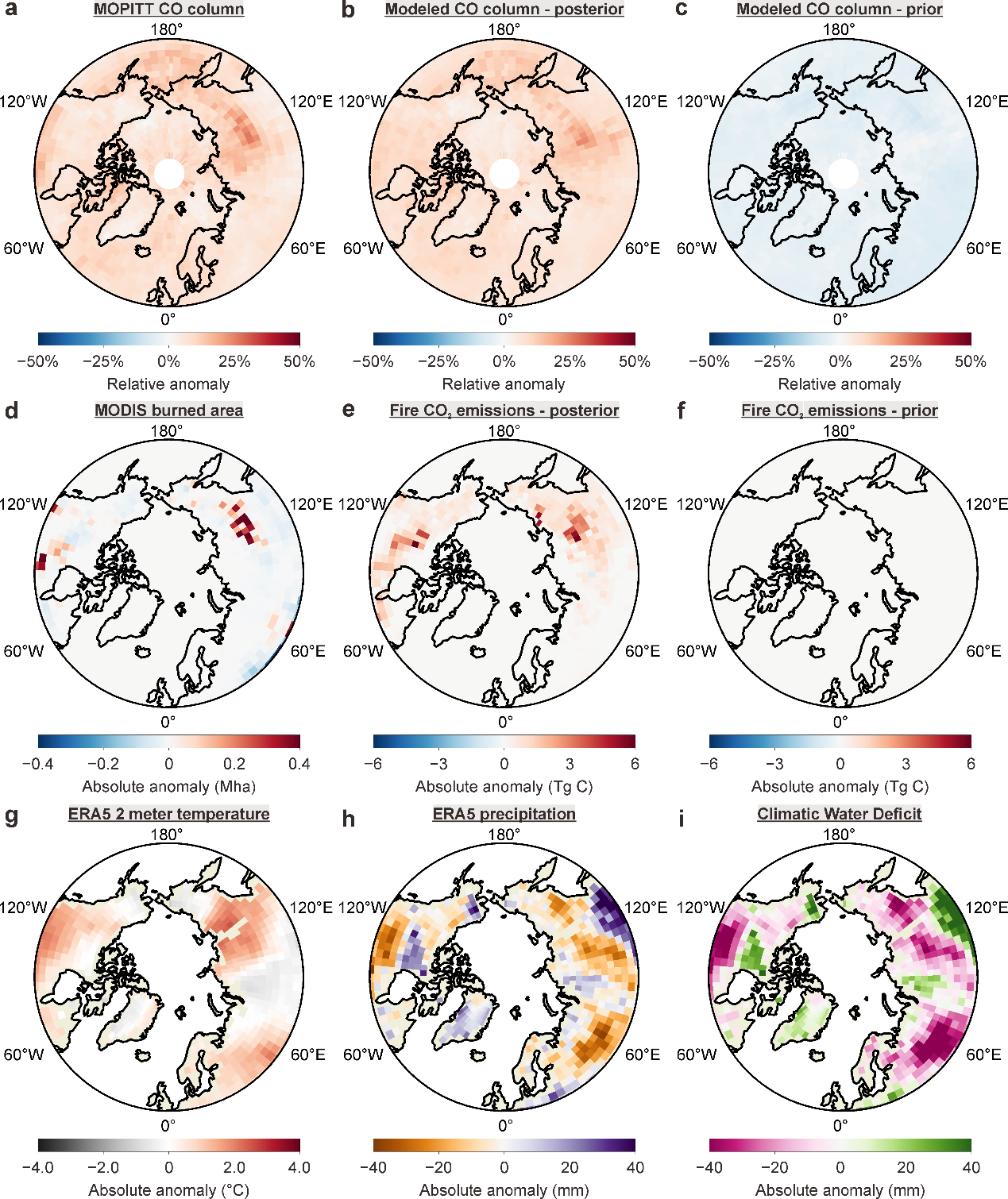 北极变暖速率是全球其他区域的两倍以上,气候变暖使植被茂盛生长,高温热浪将“燃料”变得异常干燥,导致北半球中高纬地区的野火发生风险增加。为准确、及时追踪全球野火排放,团队创新性建立了利用一氧化碳卫星遥感数据反演全球野火二氧化碳排放的新方法,基于一氧化碳排放反演数据重构野火燃烧效率的时空动态变化,实现了对野火二氧化碳排放的高精度动态监测。在这一新方法基础上,团队进一步自主研制了全球野火碳排放近实时量化追踪系统,反演量化了2000至2021年野火二氧化碳排放的时空格局,系统解析了北半球中高纬地区野火(以下简称北方野火)2021年创历史新高排放背后的驱动因素,揭示了气候变暖-野火排放之间的正反馈机制与潜在未来风险。