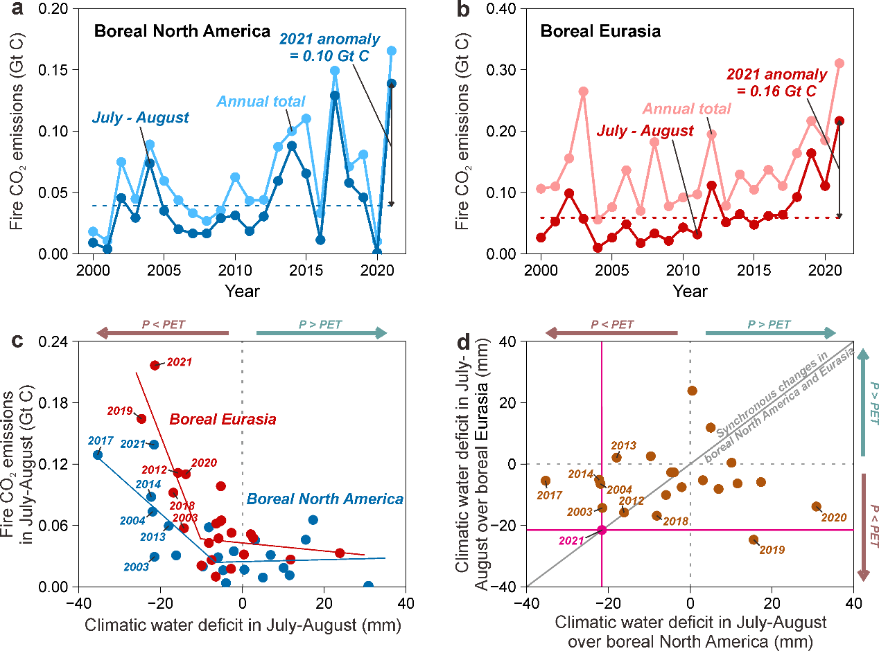研究指出,土壤水分亏缺是北方野火燃烧增加的重要驱动力,野火向高纬度寒带森林的扩张与土壤水分亏缺程度的加剧密切相关, 2021年的极端干旱与热浪共同助推了这一年的野火燃烧与碳排放打破历史纪录(图3)。在高纬度寒带森林,过去二十年夏季土壤水分亏缺程度逐年加重的区域均伴随有夏季野火燃烧及碳排放的快速增加。在水分亏缺严重的年份和地区,如2017年加拿大北部森林、2019年西伯利亚森林,均发生了严重的野火燃烧,二氧化碳排放量显著高于多年平均水平。2021年夏季,这两个区域的气温偏高、降水及土壤湿度偏低、热浪指数偏高,均达到了自2000年以来的极值水平。俄罗斯西伯利亚及加拿大北部森林同时出现严重的土壤水分亏缺,7至8月累计水分亏缺量均超过了20毫米,这在2000年以来是第一次出现。