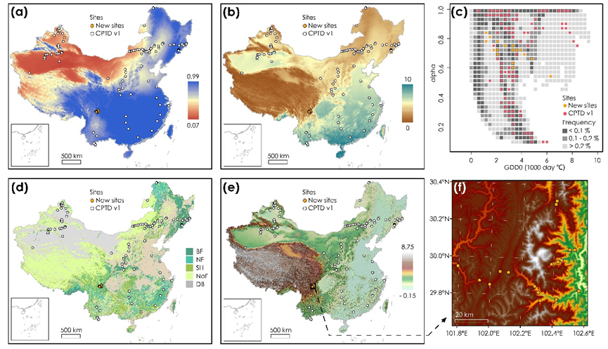 图1 中国植物性状数据库第一版及第二版更新的样点的地理和气候空间分布情况。地图(a-c)显示样点在湿润指数(alpha,a)和生长度日(GDD0,b)空间梯度上,以及在二者构成的气候空间上的分布情况;地图(d-f)显示对不同宏观植被类型(d)和海拔的取样情况(e),尤其是在贡嘎地区沿海拔梯度的取样情况(f)。