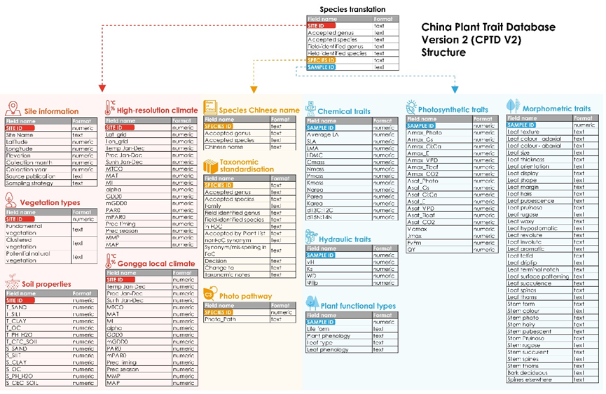 然而,第一版中国植物性状数据库中依然存在着许多不足。为克服数据库在数据覆盖度和综合性方面的局限性,研究组通过增加高山植被采样、测量及提取多个水力性状和高分辨率环境信息,构建了第二版中国植被性状数据库,并对数据库结构和数据质量控制进行了完善。相关研究以“The China plant trait database version 2”(中国植物性状数据库第二版)为题发表在国际学术期刊《科学数据》(Scientific Data)上。