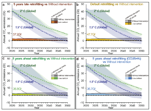 研究提出,及早推广低碳和零碳技术是实现全球钢铁工业深度减排的关键。全球钢铁行业如按现状运营,其2020-2050年间的累积二氧化碳排放将高达1063亿吨。如在设施改造窗口期期间对其进行低碳和零碳技术升级,2020-2050年间全球钢铁行业累积碳排放将减少到477亿吨。如在设施改造窗口期之前五年进行技术升级,全球钢铁行业2020-2050年累积碳排放将进一步减少到368亿吨(图2)。