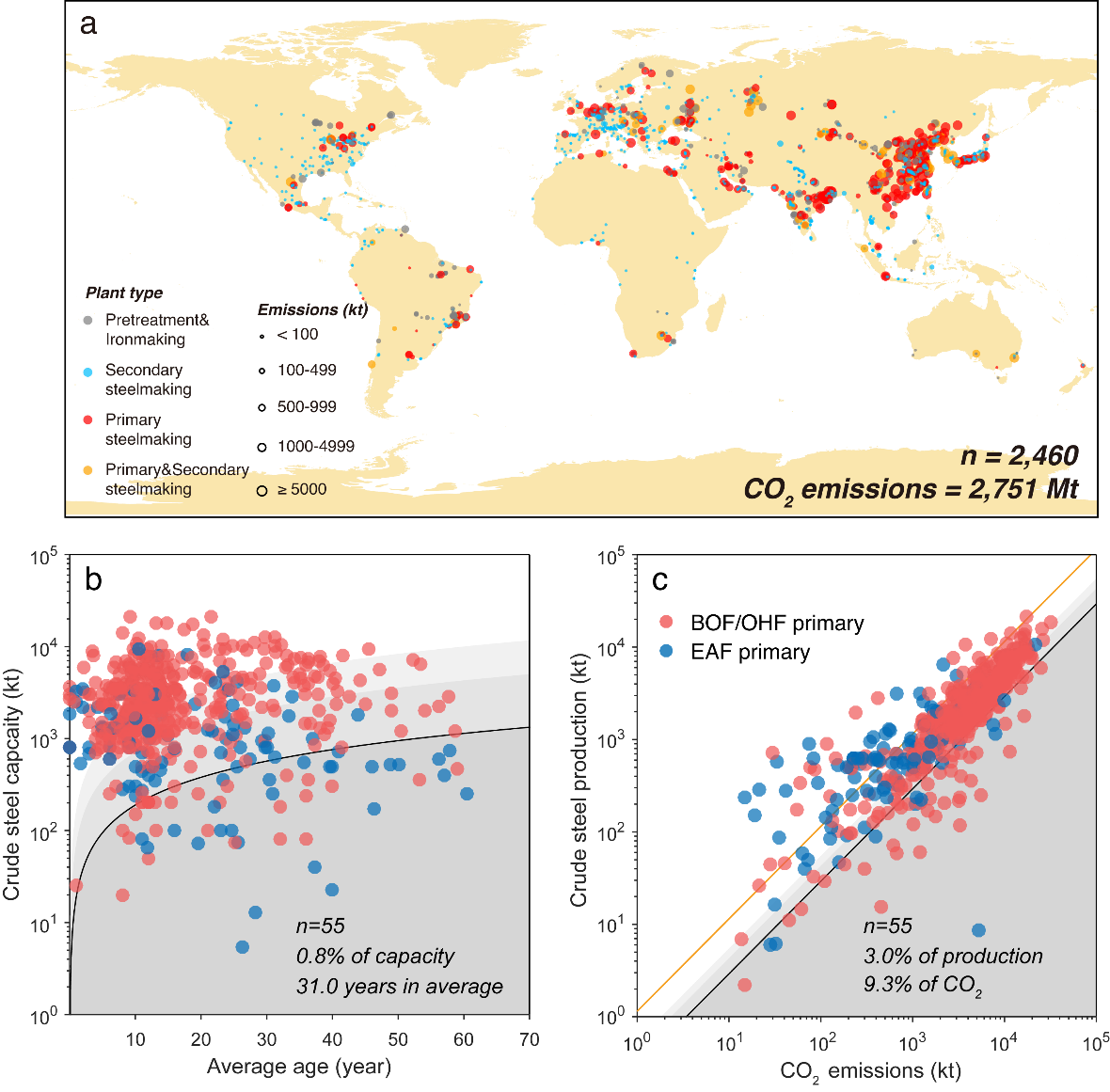在这一研究中,团队首先搜集整理了包含炼焦、烧结、球团、炼铁和炼钢等主要工序的全球钢铁行业设施级别基础信息,在此基础上构建排放动态表征算法,自主研发了包含一万多个设施的全球钢铁行业碳排放数据库,将全球钢铁排放表征能力从区域和行业尺度提升到单个设施和工序尺度(图1)。在此基础上,研究发现全球不同国家的钢铁行业设施在规模、技术、服役年限和碳排放方面存在巨大差异。例如,中国以燃煤高炉-氧气顶吹转炉(Coal BF-BOF)为主,平均碳排放强度约为1.6(t CO2/t粗钢,下同),低于全球平均水平(1.7);而印度钢铁行业主要以燃煤高炉-氧气顶吹转炉和煤基直接还原工艺(Coal-based DRI)为主,平均碳排放强度分别为2.3和2.7。