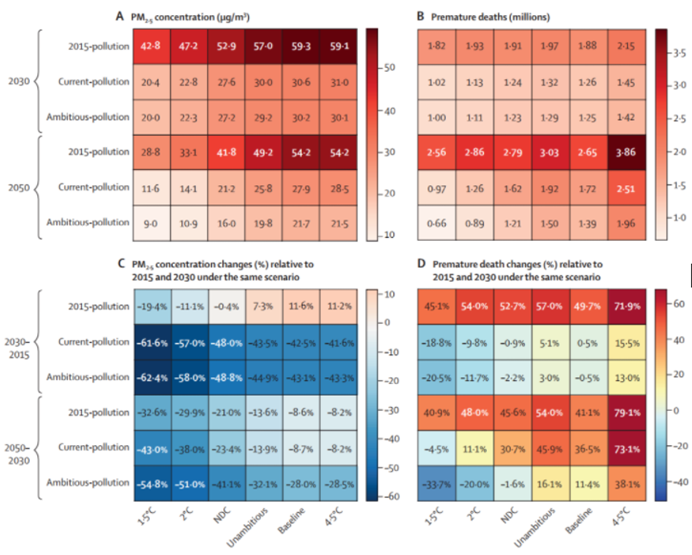 图为2030和2050年不同情景组合下PM2.5污染暴露与过早死亡变化。(A)人口加权PM2.5浓度;(B)PM2.5暴露相关过早死亡;(C)人口加权PM2.5浓度在2015-2030及2030-2050年的变化比例;(D)PM2.5暴露相关过早死亡在2015-2030及2030-2050年的变化比例。