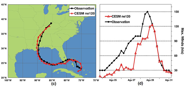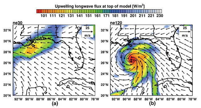 由清华大学、北京师范大学和山东大学组成的联合研究团队,根据“神威·太湖之光”超级计算机的系统特点,设计了从进程到线程的一整套优化方案,并对具有海量代码任务的经典大气模式CAM进行重构设计,将其成功地移植到国产平台上,并利用千万核规模对25公里分辨率实现了每天计算3.4年的模拟。对模式的动力框架部分,更是实现了千万核规模下750米的分辨率,及3.3PFlops的计算性能。基于该成果,团队实现了对卡特里娜飓风整个生命周期的准确模拟。该工作的成功完成,对未来面向E级(百亿亿次)计算系统的应用开发具有重要借鉴意义,并在程序设计、优化方法等方面提供了宝贵经验。