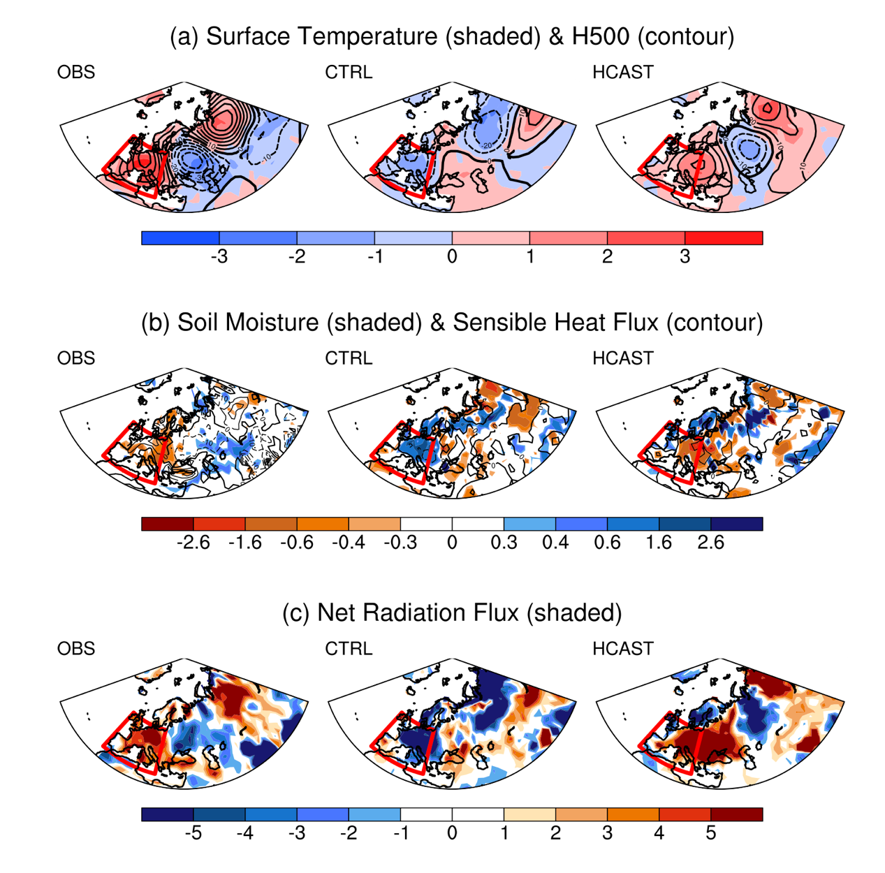 针对上述问题,研究团队利用新开发的陆面耦合数据同化系统,将青藏高原观测数据融入耦合气候模式,显著提高了对2003年欧洲夏季热浪的年际预测能力,揭示了青藏高原对2003年欧洲夏季热浪年际可预测性的重要影响。成果以“Uncovering the interannual predictability of the 2003 European summer heatwave linked to the Tibetan Plateau”为题,近期在NPJ Climate & Atmospheric Science(《气候与大气科学》)期刊发表。