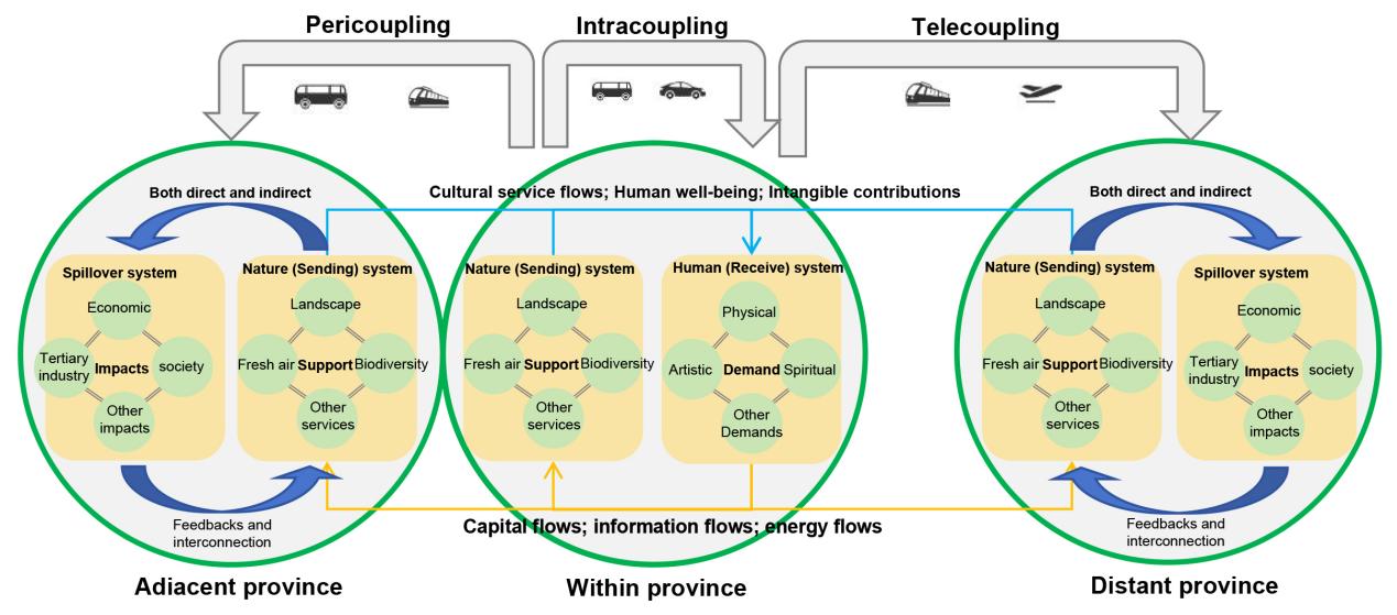 图1. 生态系统文化服务流动元耦合框架。Intracoupling、pericoupling以及Telecoupling统称为Metacoupling(元耦合)。