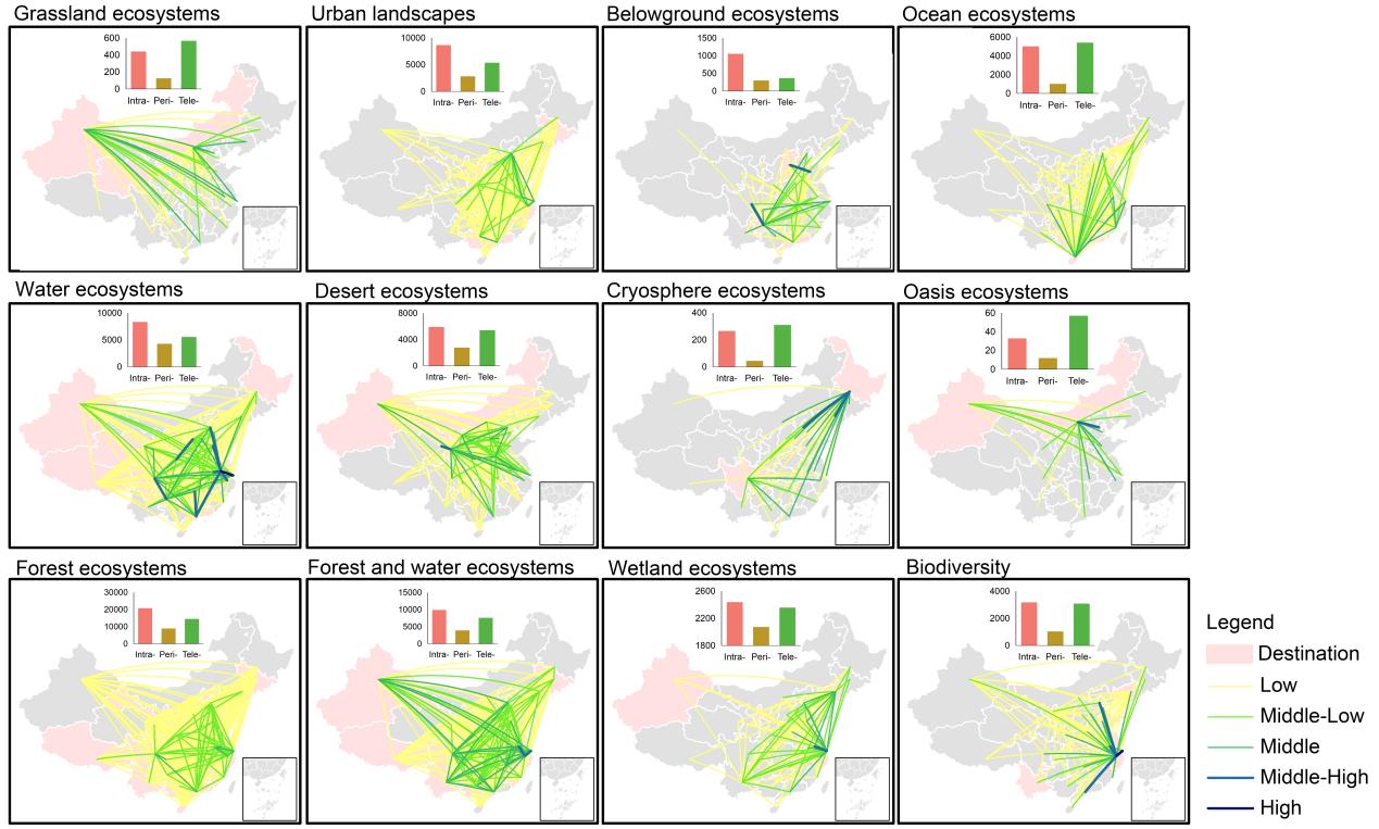 研究还揭示了不同生态系统的文化服务流动差异。约有三分之一的游客选择从森林生态系统获取文化服务(图2);偏好沙漠生态系统文化服务的游客比例为9.80%,高于对海洋(7.96%)和湿地生态系统(4.78%)的偏好。同时,沙漠绿洲和冰冻圈生态系统对于距离其更远的游客有较大吸引力,在跨省耦合方面表现突出,而森林和城市景观在省内旅游中更为显著。