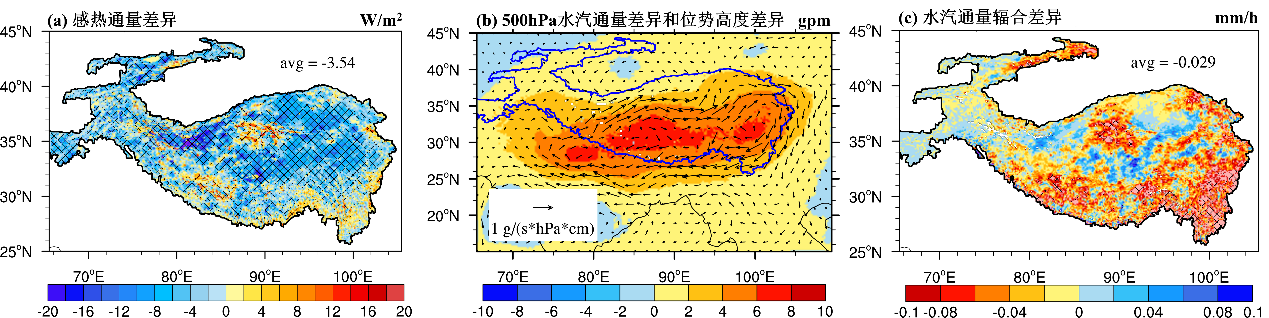 上述对比模拟表明,小尺度云起到了显著减少地表太阳辐射的作用(图2d),从而削弱了陆气交换强度,减弱了地表蒸散发和感热通量(图3a)。这一方面直接减少了地面对大气水汽的局地补给,另一方面抑制了青藏高原的“热泵”效应,导致500 hPa位势高度增加,围绕高原的季风环流被削弱(图3b),从而抑制远程水汽向青藏高原输送(图3c)。