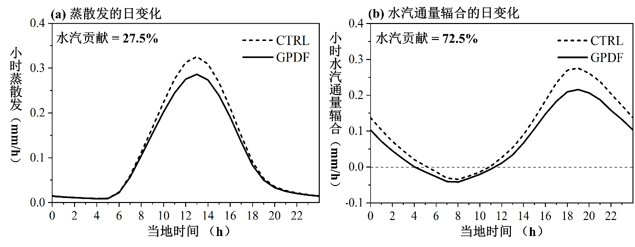 由此可见,小尺度云的存在既可以通过削弱局地蒸散发来减少降水,也可以通过减弱季风水汽输送来减少降水。为探究主导降水减少的过程,研究组利用大气中的水汽平衡方程分解了局地和远程的水汽贡献,发现蒸散发的减少主要发生在当地时间的10:00-16:00(图4a),而水汽通量辐合的减少则在全天均能发生,且后者对减少降水起主导作用,其贡献约占70%(图4b)。