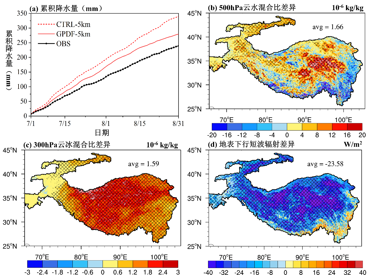 图2 青藏高原2018年7-8月平均的(a)WRF模拟和站点观测(OBS)平均的累积降水量(单位:mm),(b)500 hPa云水混合比差异(单位:10-6 kg/kg),(c)300 hPa云冰混合比差异(单位:10-6 kg/kg),(d)地表下行短波辐射差异(单位:W/m2)(5 km格距时GPDF方案减CTRL方案)。(b-d)中的阴影区域表示通过了显著性检验(p=0.1)。