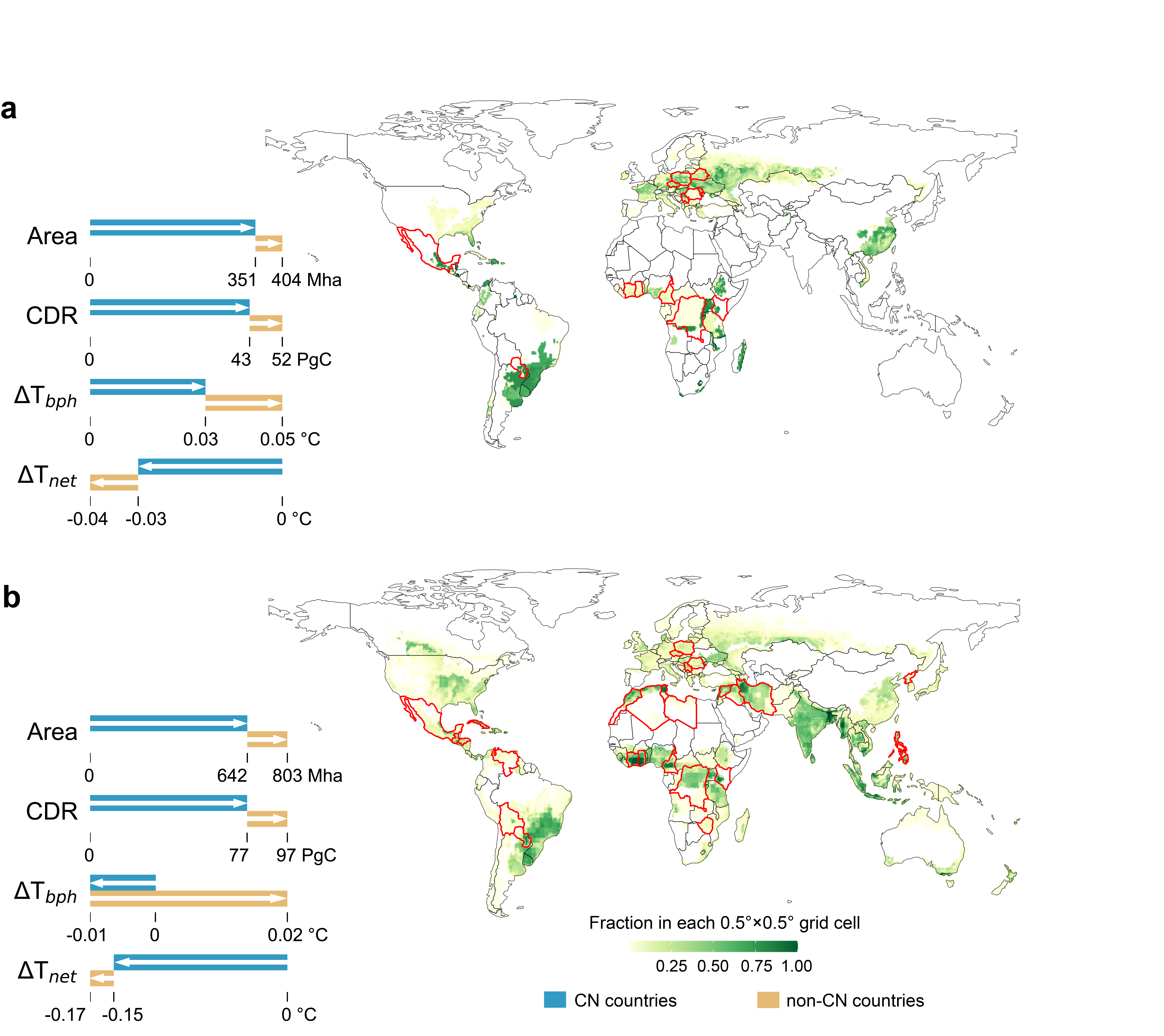 图1 生物能源作物种植分布及碳中和与非碳中和国家对全球气候变化缓解的贡献(红色边框表示种植面积超过1公顷的非碳中和国家)