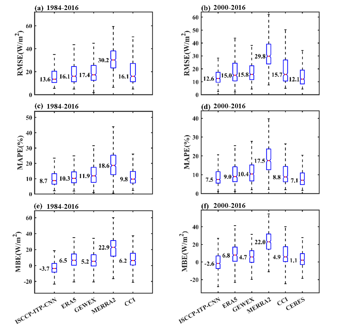 图 2 基于1984-2016年间GEBA月平均辐射观测数据对新数据ISCCP-ITP-CNN、再分析资料ERA5和MERRA2、卫星遥感产品GEWEX- SRB (GEWEX)、Cloud_CCI (CCI) 和 CERES-EBAF(CERES)数据的误差评估,左列是1984-2016年的数据评估结果,右列是2000-2016年的评估结果。其中, RMSE、MAPE和MBE分别代表均方根误差、平均绝对百分比误差和平均偏差,箱线图左侧的数字代表中位数。