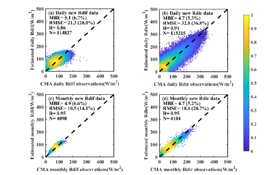 图 3 本研究发展的逐日(a)散射辐射和(b)直射辐射和月平均的(c)散射辐射和(d)直射辐射与中国气象局站点观测比较的散点图和误差。图中MBE、RMSE、R和N分别代表平均偏差、均方根误差、相关系数和散点个数,括号中的百分数为相对误差,评估时段为1994-2015年。