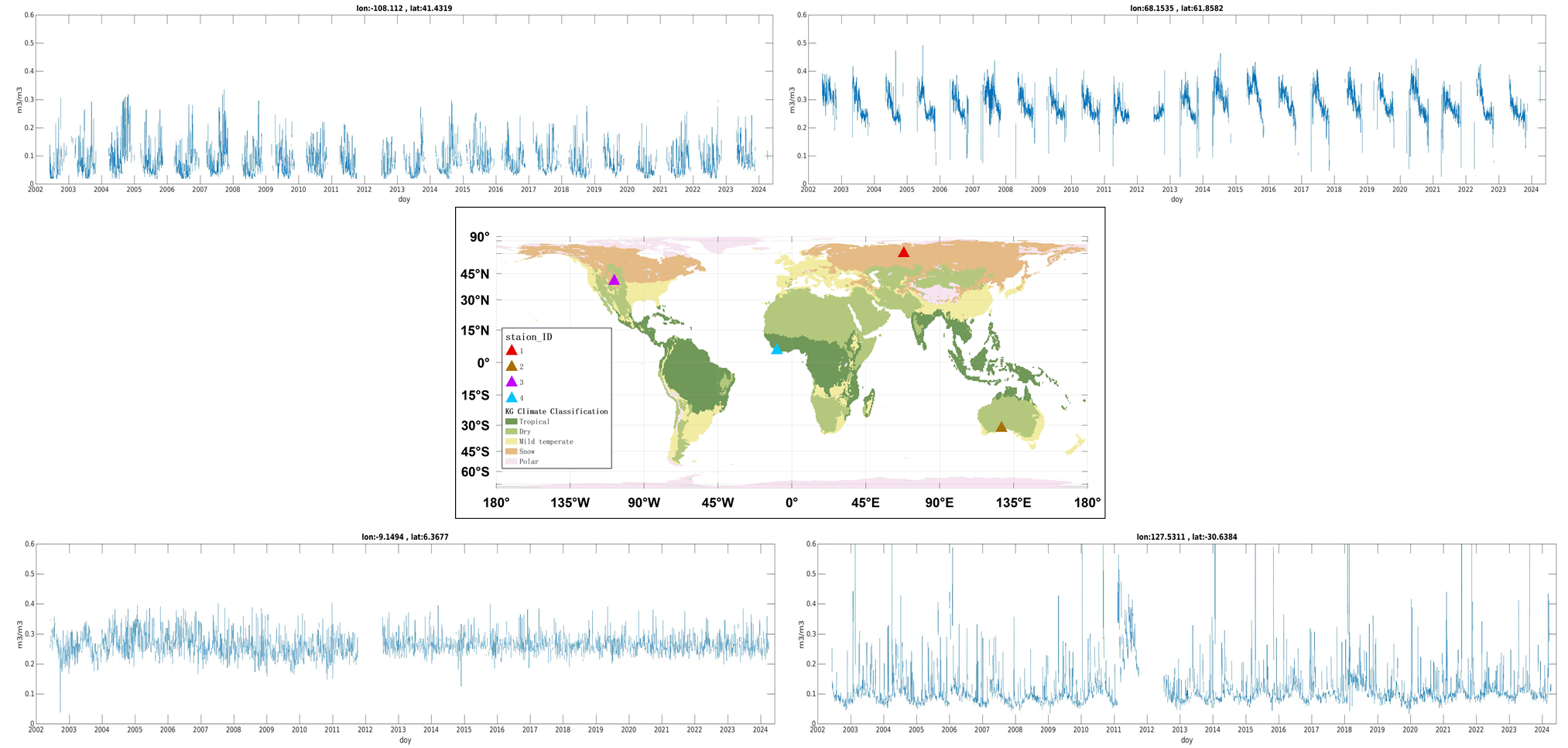 图2展示了该土壤水数据集在全球不同气候区的4个格点的日时间序列,从2002年7月27日到2024年4月8日。可以看出该套数据集在这些格点上表现稳定,具有明显的季节变化;同时,不同的格点间也体现出明显的不同气候带之间的差异。