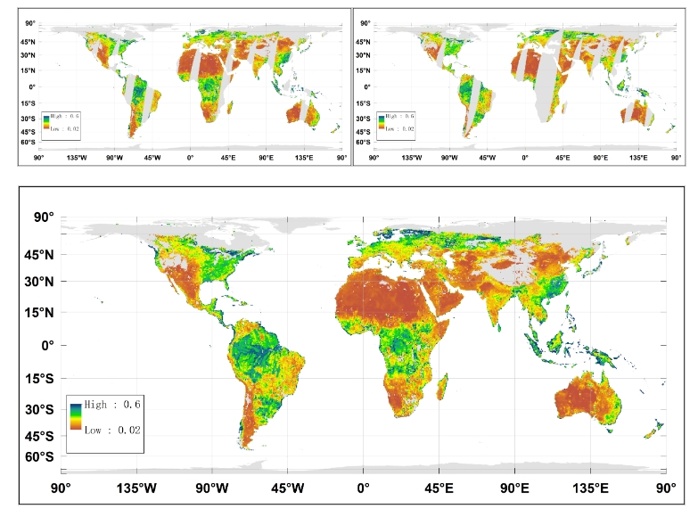 下图为最近的2024年4月7-8日全球土壤水分分布图和两天融合后的平均土壤水分。基于连续两天的数据产品,可以实现全球陆地绝大部分区域的土壤水分观测。