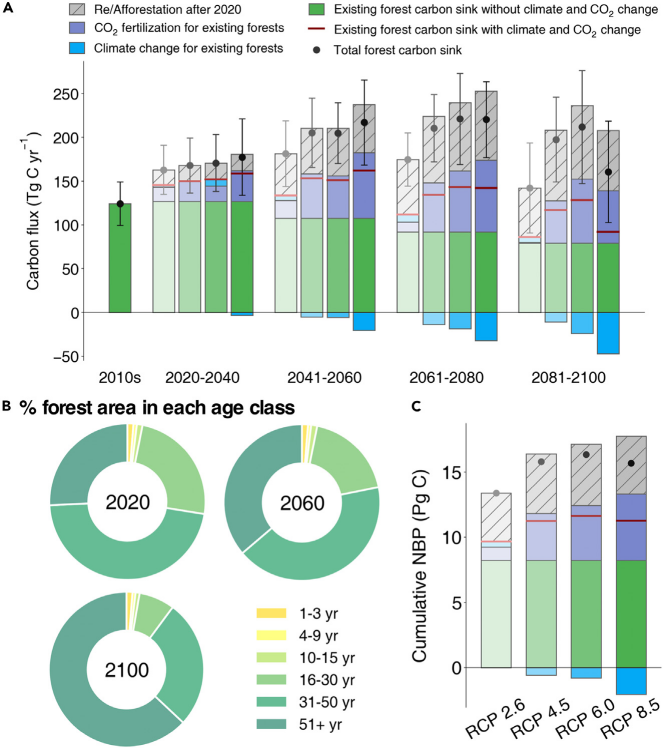研究结果表明,2010-2019年中国陆地生态系统碳汇约为198±54 Tg C yr-1,其中森林碳汇约为124±25 Tg C yr-1,主要由中龄林贡献。在充分考虑中国未来造林目标及不同气候变化情景的影响后,模拟结果显示,中国森林碳汇将从2041-2060年的181~217 Tg C yr-1降低到2081-2100年的142~212 Tg C yr-1。现存森林是未来森林碳汇的主要来源,但受林龄老化及二氧化碳浓度升高趋势变缓的影响,现存森林碳汇在未来每年将减少约0.35~1.1 Tg C yr-1。未来新/再造林可以通过增加森林面积以及更新林龄结构提供额外的森林碳汇。研究强调了考虑林龄动态变化对于陆地碳汇评估的重要性,指出通过科学的森林管理来延缓林龄老化是提升森林碳汇的有效途径。
