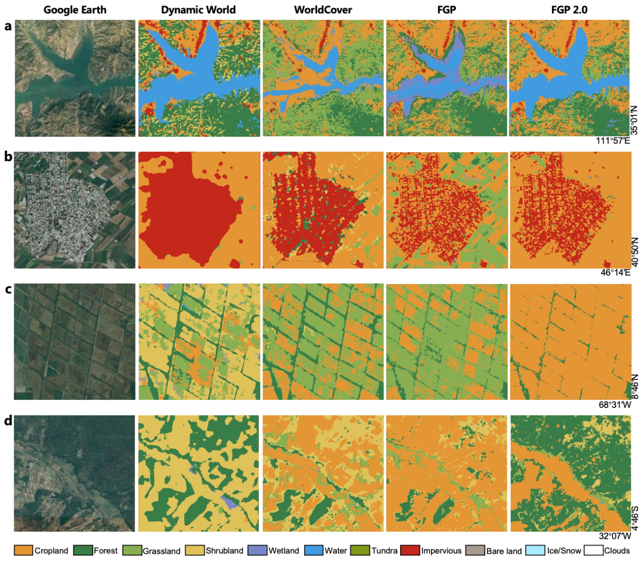 研究结果显示,FGP 2.0的土地覆盖年度制图精度较FGP 1.0提高了约5%,动态制图精度提高了约20%,能够提供更为精细准确的土地覆盖变化制图结果(图2)。此外,通过可扩展的灵活制图框架,FGP 2.0展示出针对不同应用场景定制土地覆盖监测结果的良好潜力。