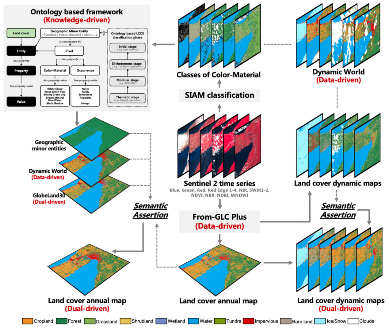 高时效、高精度的土地覆盖变化数据是可持续发展研究、地球系统模式开发、资源管理及生态环境评价等领域的重要基础。传统的土地覆盖制图方法通常依赖于单一的数据驱动模型或知识驱动模型,然而前者在应对复杂环境变化时可能缺乏足够的适应性,后者则可能因数据不足或先验知识不完善而导致精度较低。随着环境变化的复杂性和多样性日益增加,亟需一种能够整合数据驱动和知识驱动优势的新方法,以提升土地覆盖制图的时空精度和实时监测能力。