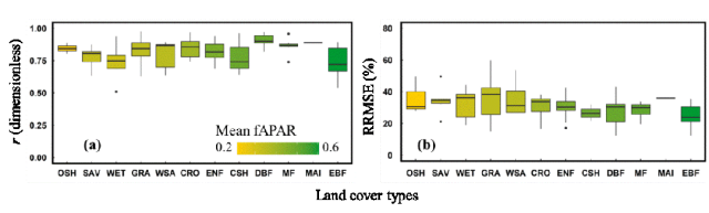图3 不同生态系统类型站点模型估算结果相关系数与均方根误差。生态系统类型代码参考IGBP分类系统。