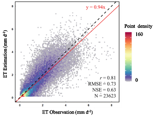 为实现该目标,研究组基于生态演化最优性理论,假设植物能够适应气象条件的变化调整气孔导度以实现净碳收益最大化,即单位水分消耗下的碳收益趋近于一个边际最优值。研究以MODIS遥感观测资料作为输入,构建了具有普适性的蒸散估算模型;同时将该模型部署到Google Earth Engine云计算平台,并筛选了全球分布的FLUXNET站点观测资料、径流资料,以实现对模型的多尺度验证(图1)。成果以“Towards a universal evapotranspiration model based on optimality principles”为题,近期在国际学术期刊Agricultural and Forest Meteorology《农林气象学》上发表。