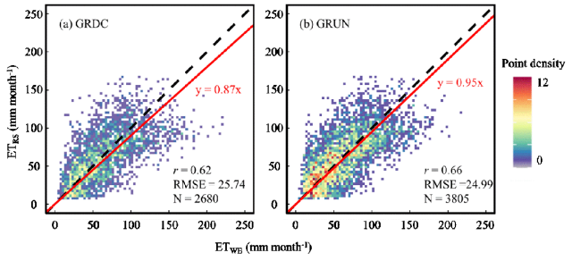 图4 流域水平衡验证结果。其中图a使用GRDC提供的水文站点观测径流资料;图b使用GRUN提供的再分析径流资料。