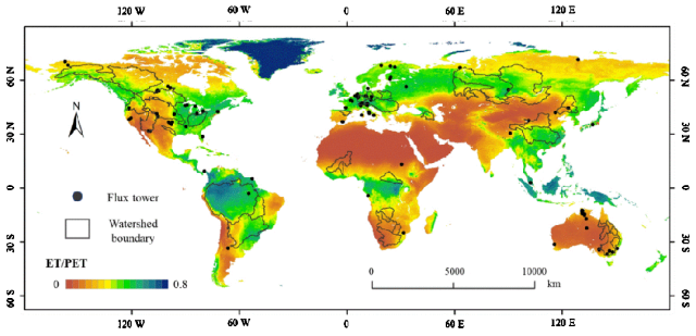 图1 研究使用的FLUXNET通量站点与流域空间分布。背景为实际蒸散与潜在蒸散的比值,代表环境干燥程度。