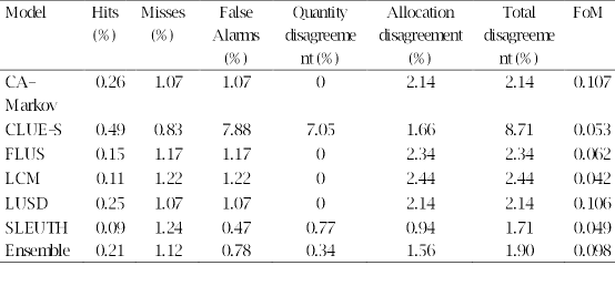 表3. 模型预测结果的三图比较检验结果,以真实土地利用变化作为土地需求输入