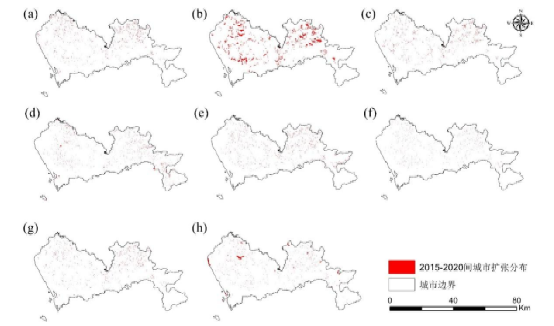 图2. 2015-2020年各模型模拟预测的城市扩张空间分布,以真实土地利用变化作为土地需求。(a) CA-Markov; (b) CLUE-S; (c) FLUS; (d) LCM; (e) LUSD; (f) SLEUTH; (g) 集成结果; (h) 2015-2020年真实的城市扩张空间分布。