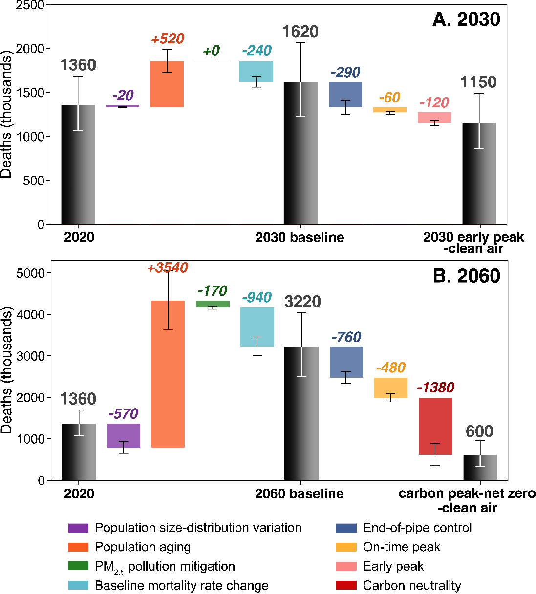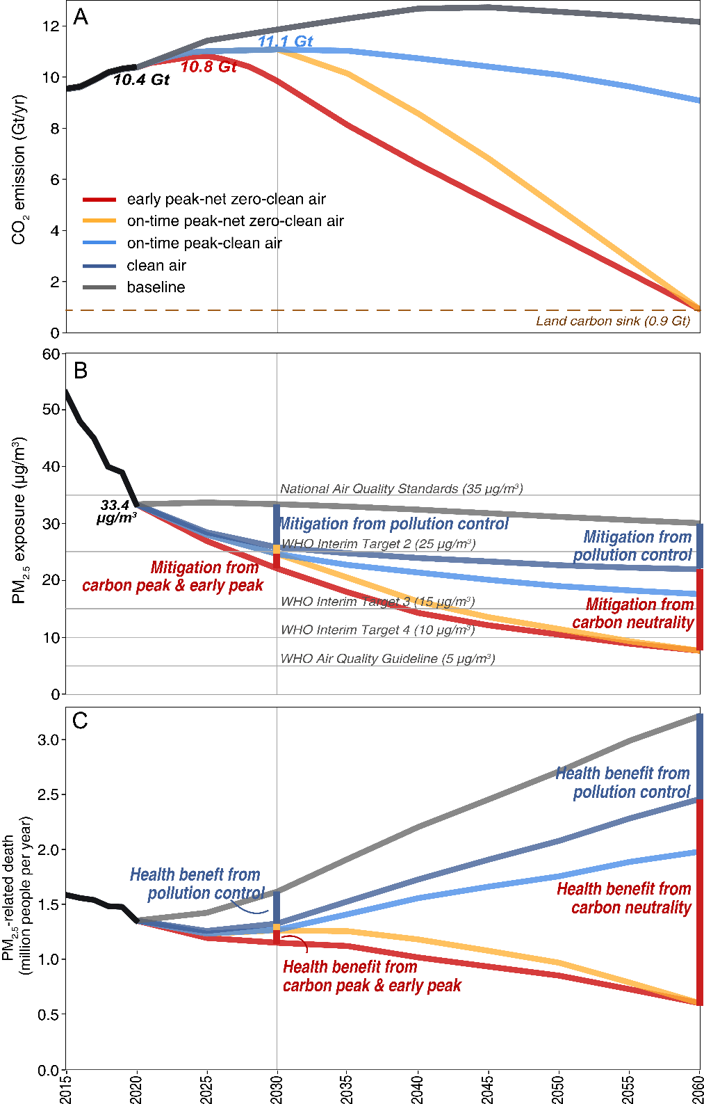 在这一背景下,清华大学地球系统数值模拟教育部重点实验室张强课题组基于自主研发的中国碳中和与清洁空气协同科学评估与决策支持平台(CNCAP),设计五组不同力度减排路径并对各个路径下未来空气质量及相关健康损失变化进行对比分析,揭示了2020-2060年间中国实施碳中和与清洁空气协同路径所产生的巨大健康效益,并通过一系列组合情景分析,分时段、分区域定量解析了未来推动空气质量改善和减少污染健康损失的主要驱动因素。上述研究成果以《中国碳中和与清洁空气协同路径至2060年可每年避免上百万人过早死亡》(A synergistic approach to air pollution control and carbon neutrality in China can avoid millions of premature deaths annually by 2060)为题,近日在Cell出版社旗下期刊《一个地球》(One Earth)上在线发表。