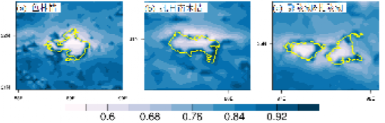 卫星观测显示,在暖季(5-9月)白天湖泊上的云频率明显低于周围陆地上的云频率,形成中空结构,并且在湖泊周围存在与湖岸线吻合良好的环状云系,即“云洞”和“云环”(图1)。这一云频率的中空结构普遍存在于超过300km⟡的高原湖泊上,但在低海拔湖泊却不常见。