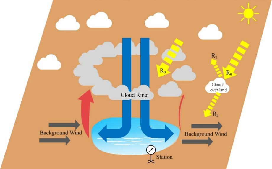 为探究湖泊对于云频率的影响机理,研究组借助湖气耦合模式,以色林错(西藏第一大湖)为例开展了高分辨率模拟。结果表明,湖面的感热远低于周围陆面的感热,湖-陆间强烈的感热梯度驱动湖陆风的形成,湖泊上空的下沉气流抑制湖上云的形成,岸上的上升支则促进云的形成,进而导致了图1中“云洞”和“云环”的形成(图2)。