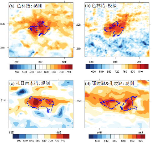 图3 2017年7月白天(a)观测和(b)模拟的色林错区域的地表短波辐射(单位:W/m2)。2016-2018年暖季(5-9月)白天观测的平均地表短波辐射(单位:W/m2):(c)扎日南木措、(d)鄂陵湖和扎陵湖。蓝色线为湖泊边界。