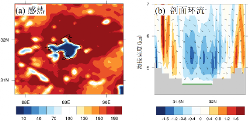 图2 模拟的2017年7月白天(a)色林错及周围陆面的感热(单位:W/m2);(b)沿色林错东西向平均的经圈环流,其中颜色代表垂直速度(单位:0.1 m/s)