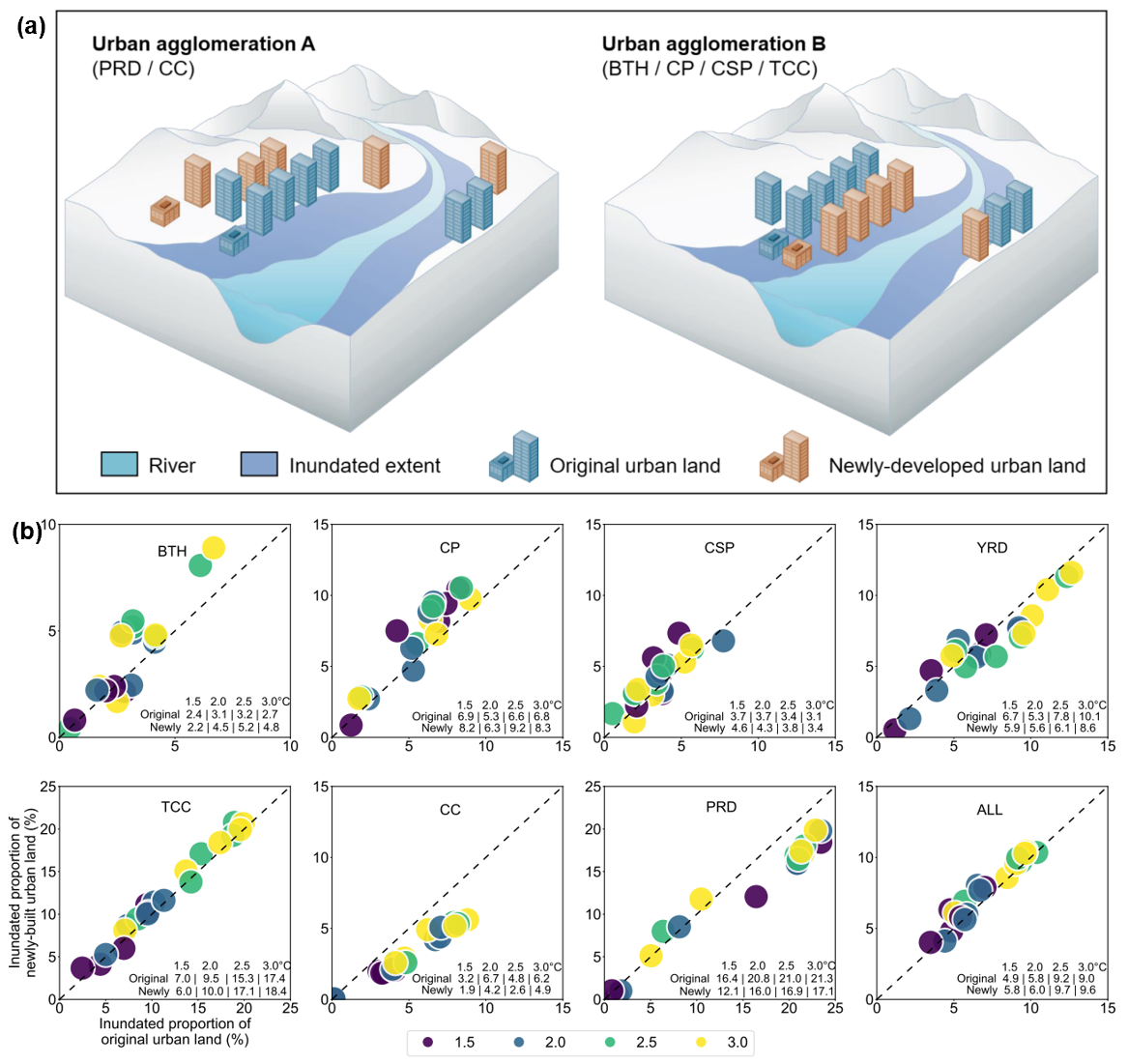 图2 已有和未来新建城市用地的被淹没情况。(a)不同城市扩张格局对已有和未来新建城市用地洪水风险的影响。(b)SSP5-8.5 情景下被淹没城市用地范围。x 轴表示未来被淹没的已有城市用地面积占已有城市用地总面积的比例,y 轴表示未来被淹没的新开发城市用地面积占新开发城市用地总面积的比例。点的颜色代表温升程度。每种颜色有五个点,代表五个气候模式的结果。右下角的数值代表基于五个全球气候模式预估得到的淹没比例的中位数。