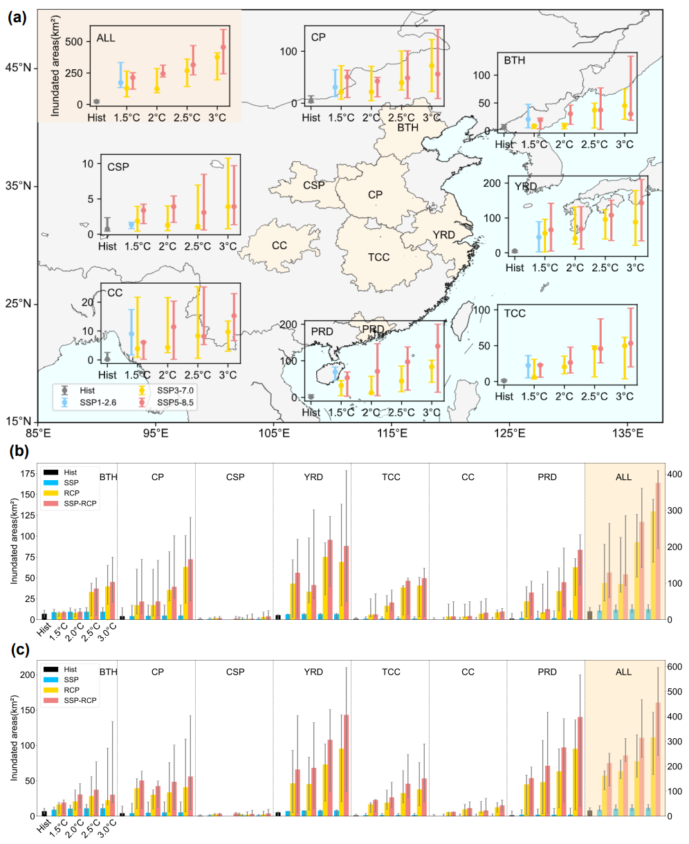 研究选取了京津冀(BTH)、长三角(YRD)、珠三角(PRD)、中原(CP)、长江中游(TCC)、成渝(CC)、关中(CSP)等7个中国的主要城市群,将生成的洪水淹没范围与未来城市用地预估产品叠加,得到未来被淹没城市用地预估数据。7个城市群的GDP及人口占中国总GDP及人口的一半以上,且位于中国主要的洪泛区内,面临极大的洪水风险。研究结果表明,未来城市用地面临洪水淹没风险的面积将增加4-19倍(图1a)。其中,南方城市群未来的洪水风险要高于北方城市群。此外,在京津冀、长三角、长江中游、珠三角等城市群中,当温升幅度超过2℃后,被淹没城市用地面积存在跃升现象,这充分凸显了将全球变暖控制在2℃以内的重要性。