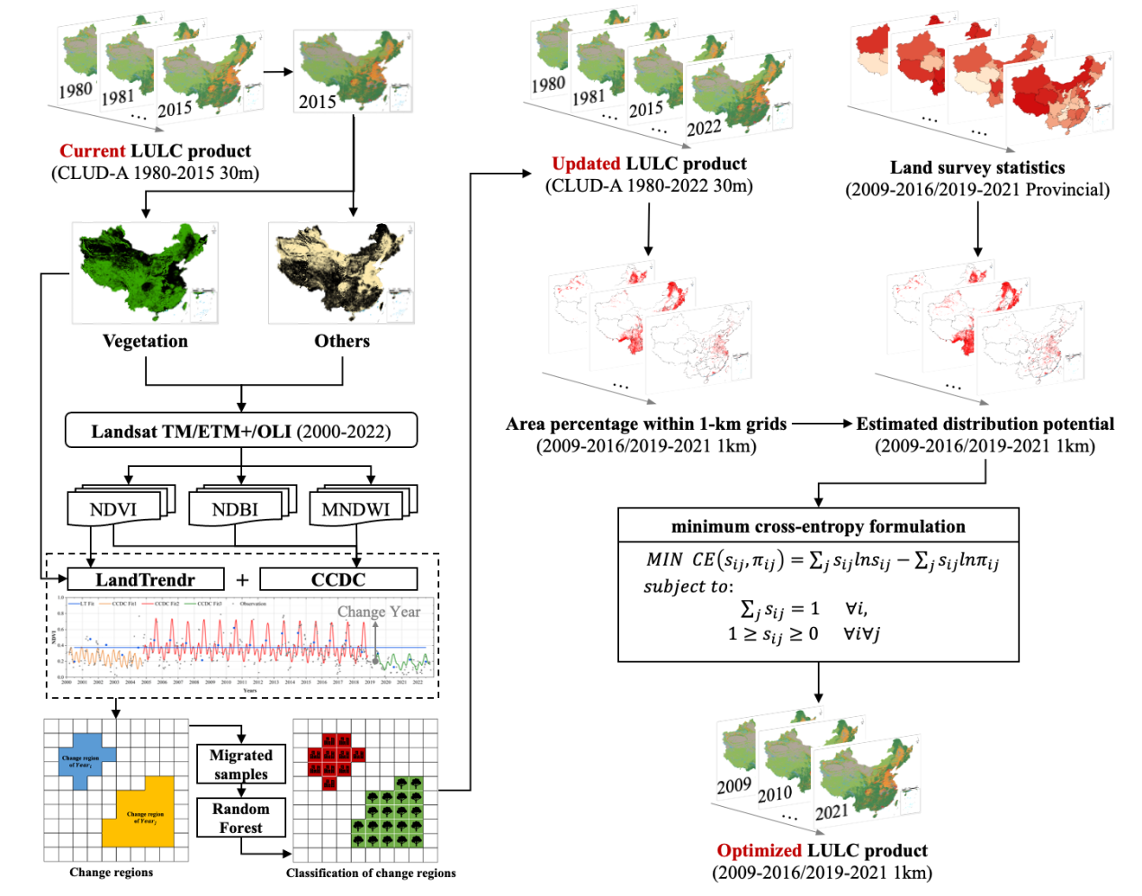 自然资源管理和生态环境评价离不开准确可靠的土地利用/土地覆盖(Land Use/Land Cover,LULC)数据,而土地调查和遥感监测是了解和掌握LULC变化的主要手段。现有的LULC遥感监测产品存在缺乏更新和精细尺度土地调查统计数据获取不足等问题。为此,清华大学地球系统数值模拟教育部重点实验室(以下简称“实验室”)俞乐副教授课题组提出了一种LULC遥感监测产品自动更新和优化的方法(图1)。该方法利用变化检测、样本迁移和机器学习,实现了已有LULC遥感监测产品的自动更新。基于第二次全国土地调查(以下简称二调)和第三次全国国土调查(以下简称三调)数据,研究进一步开发了基于最小交叉熵策略的统计数据空间分配方法,提高了遥感监测结果与二调、三调统计数据的一致性。