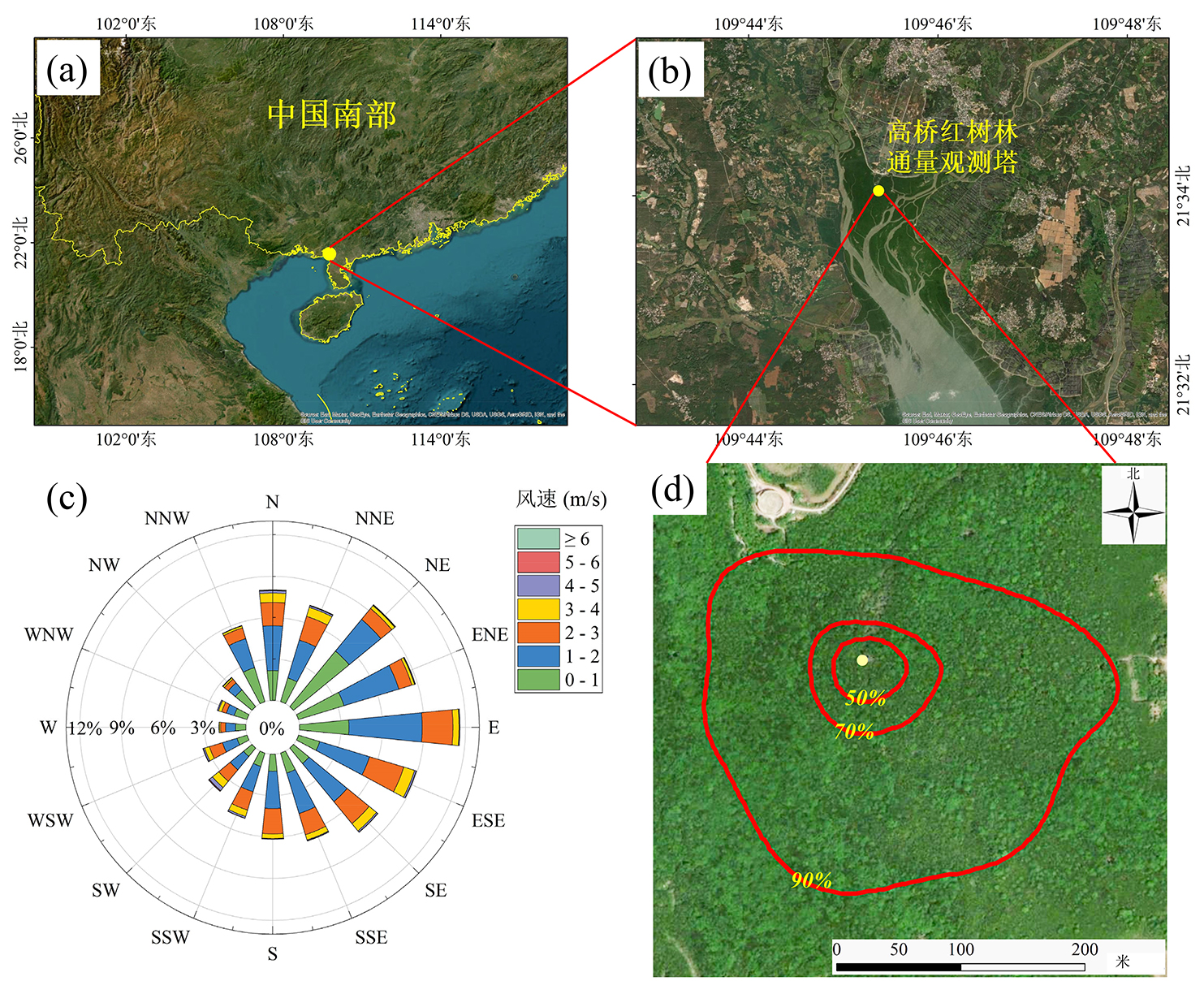 图1 研究区示意图:(a)广东湛江红树林国家级自然保护区位置;(b)高桥红树林通量站景观;(c)十年间的风速分布情况;(d)涡度协方差通量塔足迹等值线