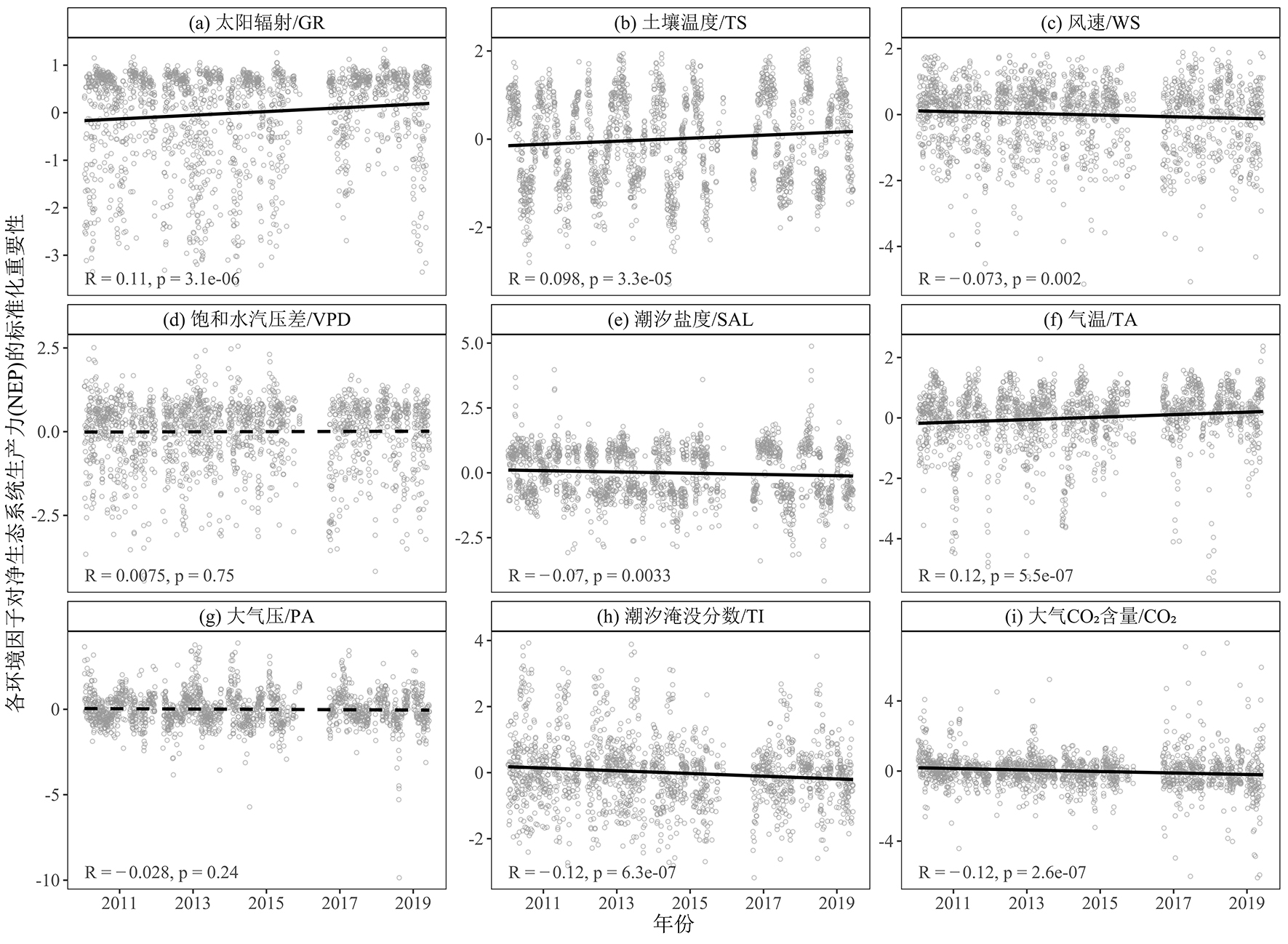 图4 环境因子对红树林净生态系统生产力(NEP)的标准化重要性在十年内的变化趋势