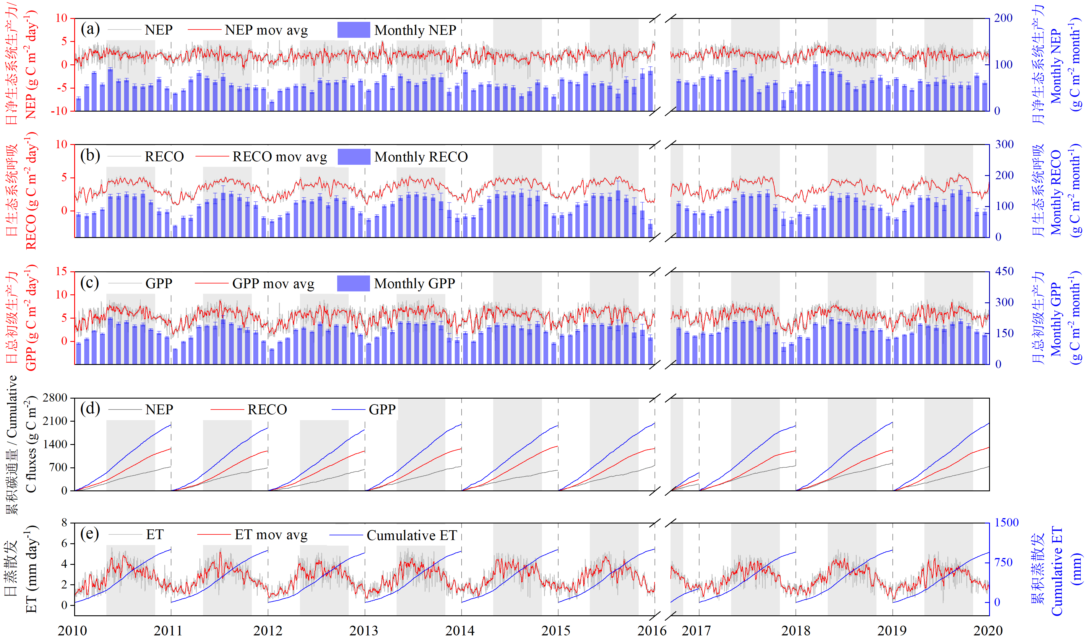 图2 十年间高桥红树林碳、水通量的时间变化规律(灰色阴影表示湿季,之间为干季)