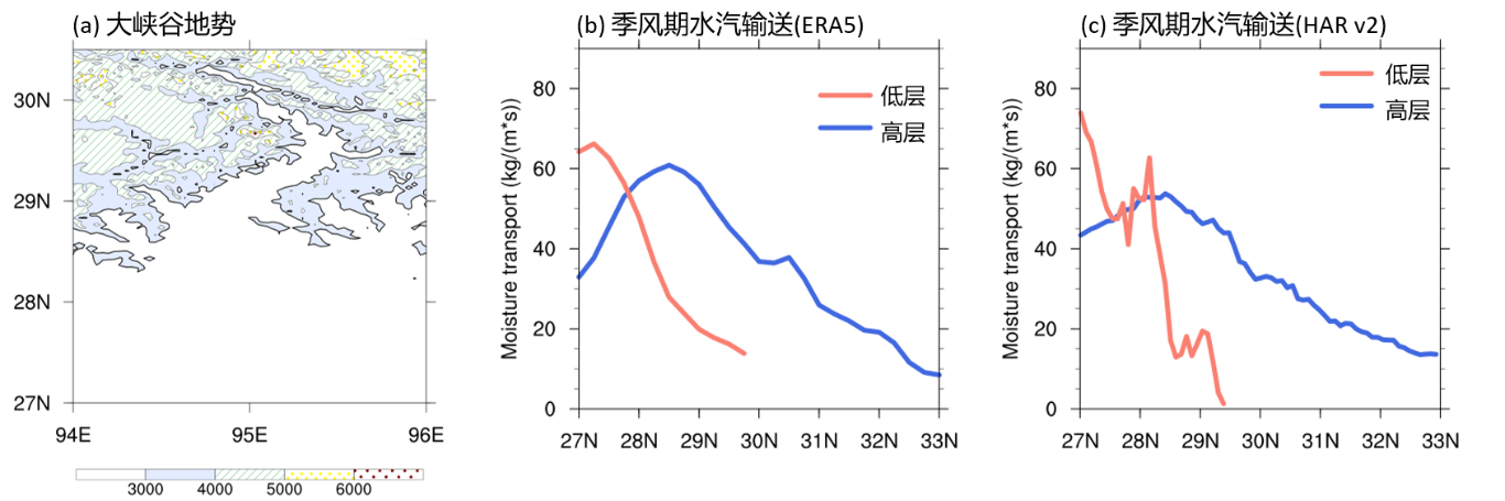 研究首先利用大气再分析资料ERA5以及高分辨率精细化模拟数据HAR v2估算了季风期(6–9 月)的水汽输送量。结果表明,雅鲁藏布江大峡谷确实是青藏高原季风水汽输送的主要通道。研究通过对水汽通量分层分析,发现入口处峡谷内(低层)水汽输送通量明显小于峡谷上(高层)水汽输送通量;向北输送的过程中,低层水汽衰减率远大于高层水汽的衰减率(图1)。这意味着雅鲁藏布江大峡谷之上的高层水汽输送更有可能影响到青藏高原东部腹地的降水,而低层水汽输送则可能对峡谷区域内的降水有重要贡献。