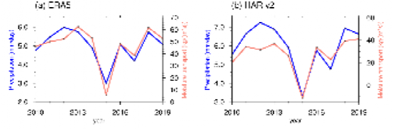 图3 基于ERA5(a)和HAR v2(b)的季风期青藏高原东部区域平均降水(30°-36°N, 88°-103°E,蓝线)与通过雅鲁藏布江大峡谷之上水汽输送(30°N, 94°-96°E,红线)的时间序列。