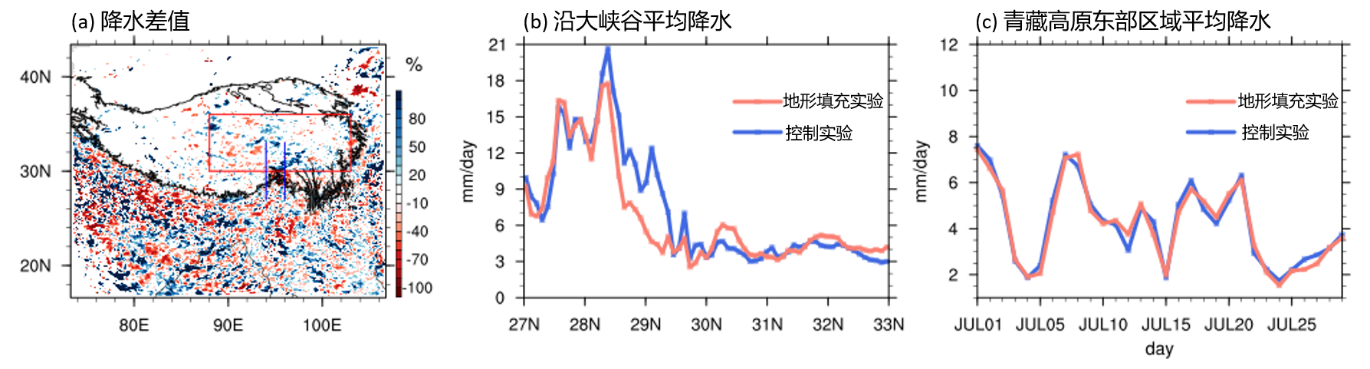 图2 (a)地形填充实验和控制实验之间模拟2018年7月降水的差值分布(地形填充实验减去控制实验)。红色矩形表示青藏高原东部地区,蓝线分别表示94°E及96°E,黑线表示青藏高原3000 m以上的高度;(b)控制实验(蓝线)及地形填充实验(红线)中沿雅鲁藏布江大峡谷(94°-96°E)平均降水随纬度的变化;(c)控制实验(蓝线)及地形填充实验(红线)中青藏高原东部区域平均降水的时间变化序列。