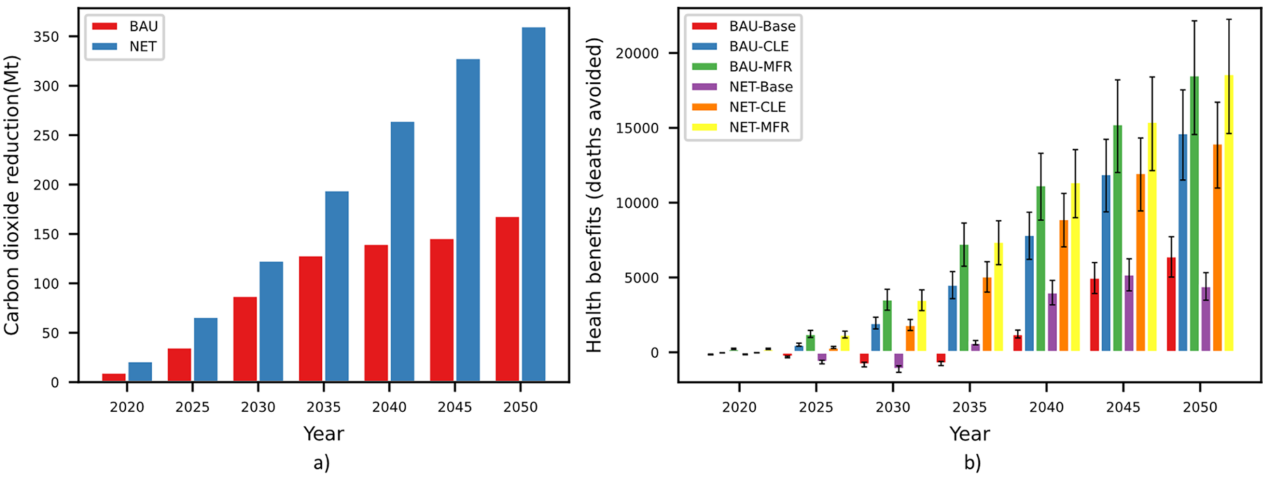 研究结果显示,随着电力部门净零排放的实现,至2050年,禁售燃油车的政策将给中国道路交通部门多带来几乎一倍的碳减排量。从年际变化来看,电力部门是否实现净零排放,将在2035年后对禁燃政策的碳减排量产生显著影响。影响健康效益的主要因素是空气污染物末端治理力度。随着电力部门对空气污染物排放控制的加强,两个电力部门碳减排情景之间的健康效益差距将缩小。从年际变化来看,2035年后,电力部门碳减排目标越大,健康效益越大。